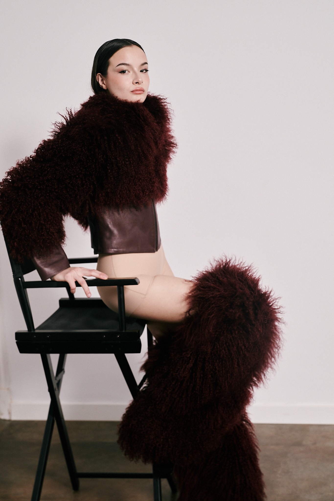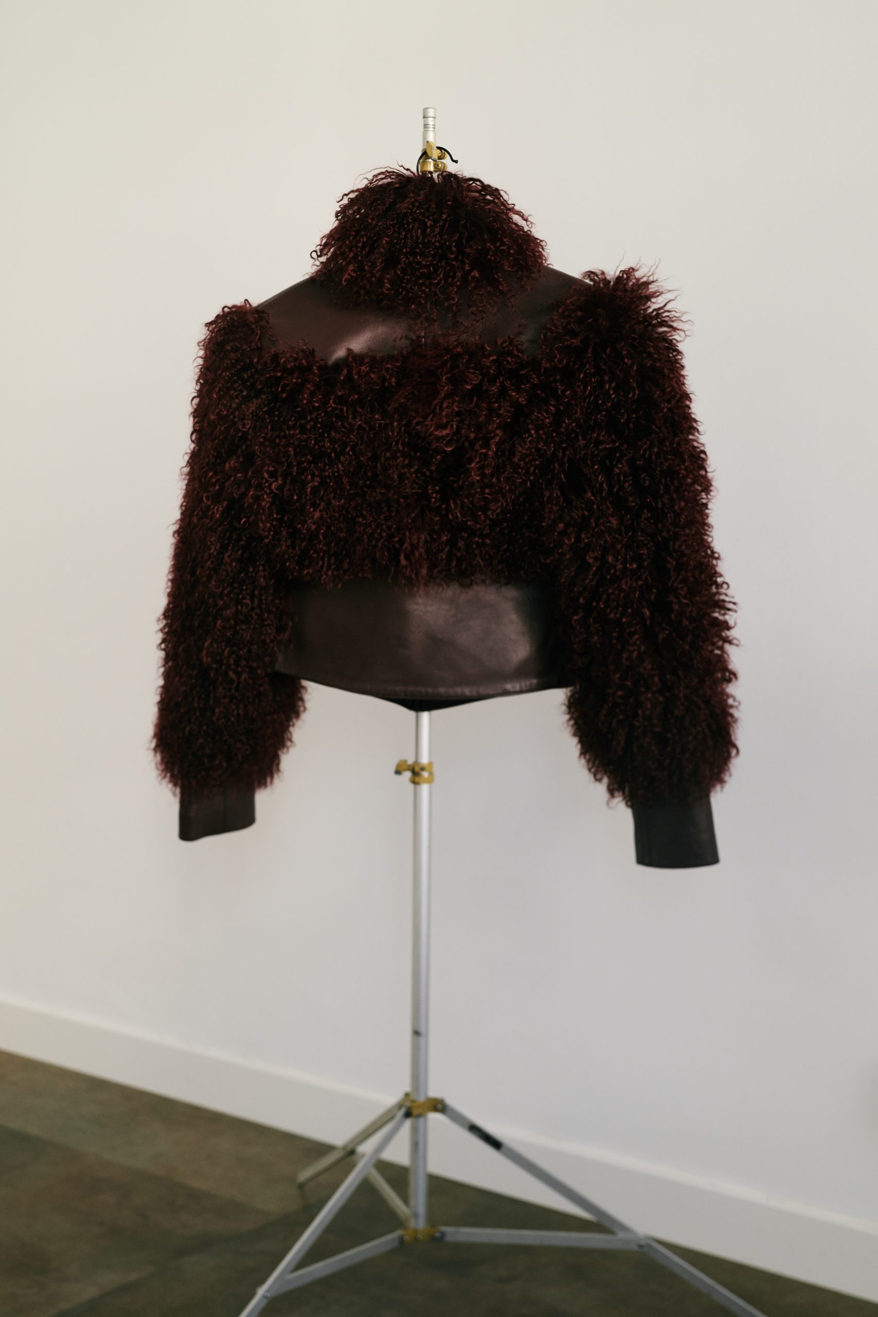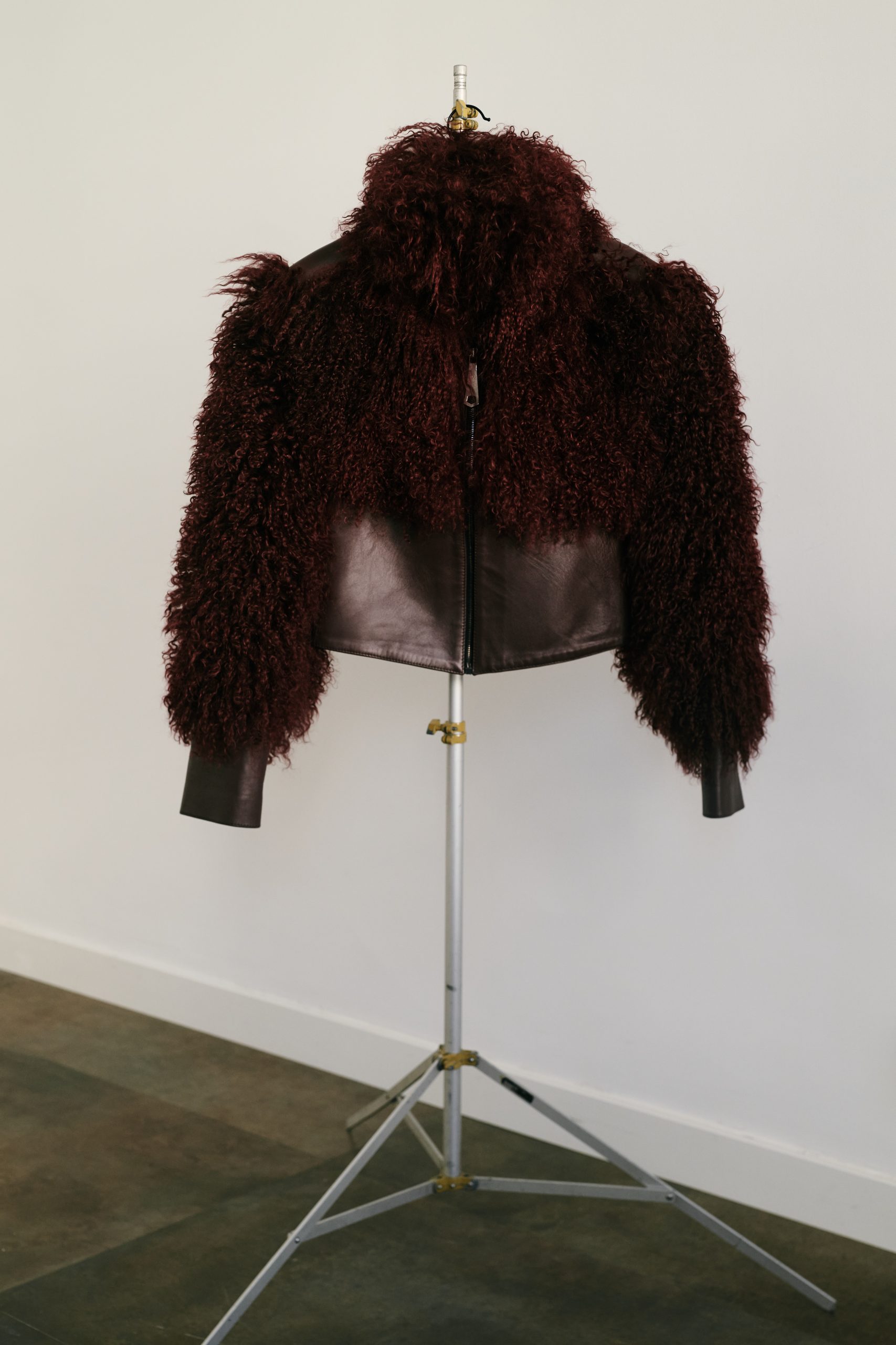 Chaqueta combinaba piel de cordero tíbet y cuero.
